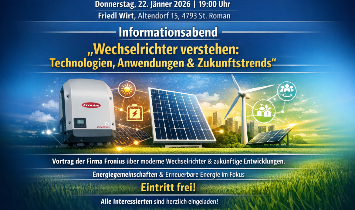 Im Rahmen der Veranstaltung gibt die Firma Fronius einen verständlichen Überblick über die Funktion und Bedeutung moderner Wechselrichter. Dabei werden unterschiedliche Gerätetypen vorgestellt, deren Einsatzmöglichkeiten erläutert und ein Ausblick auf zukünftige technologische Entwicklungen gegeben – insbesondere im Zusammenhang mit Energiegemeinschaften und erneuerbarer Energie.